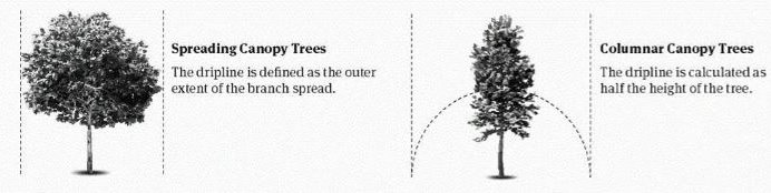 With irregular-shaped trees (e.g. leaning trees), the dripline is calculated by taking the greatest radial spread of the canopy from the trunk in a full circle around the tree.
