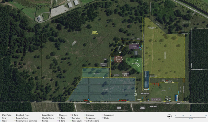 A dedicated food caravan area is proposed centrally on site alongside Stages B and C, chill-out tents, a skate facility and activation zones (sponsor areas). Day ticket holders do not have access to the camping area. A site plan showing the proposed layout can be found on page 47 of the Rolling Meadows application [PDF, 135 MB].