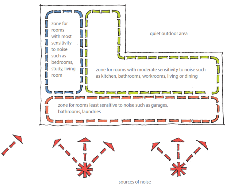 Position sensitive rooms like bedrooms, studies and living rooms further away from external noise, roads and late-night entertainment. Place less sensitive spaces like garages, bathrooms and laundries where receiver noise is highest.