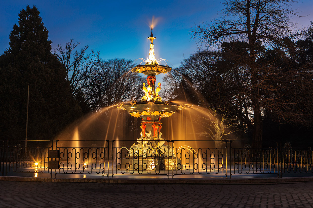 Information about the fountain in the Botanic Gardens on Armstrong Lawn adjacent to Canterbury Museum.