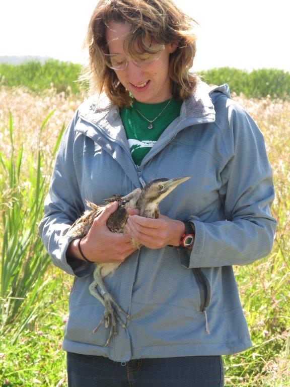 Travis Wetland, Emma Williams and endangered bittern Botaurus stellaris, one of 20 in Christchurch: Photo Brenda Greene