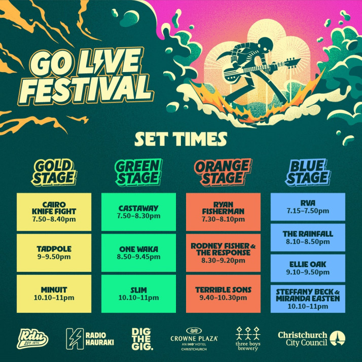A huge thank you to Dig The Gig, RDU, Crowne Plaza, Radio Hauraki and Three Boys Brewery for helping support Go Live Festival.