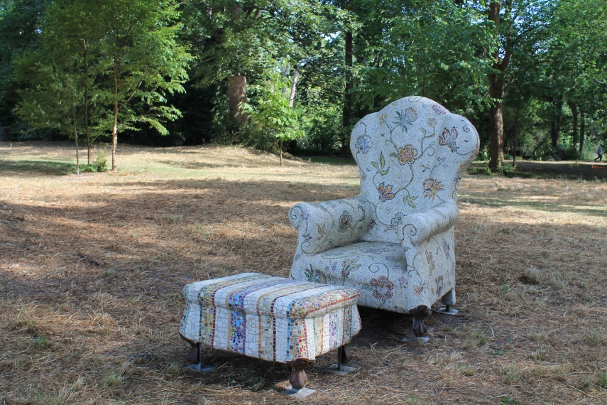 The dedicated volunteer artists of Crack'd for Christchurch collected broken china that residents couldn't bear to throw away and re-purposed it into a beautiful mosaic armchair and ottoman.