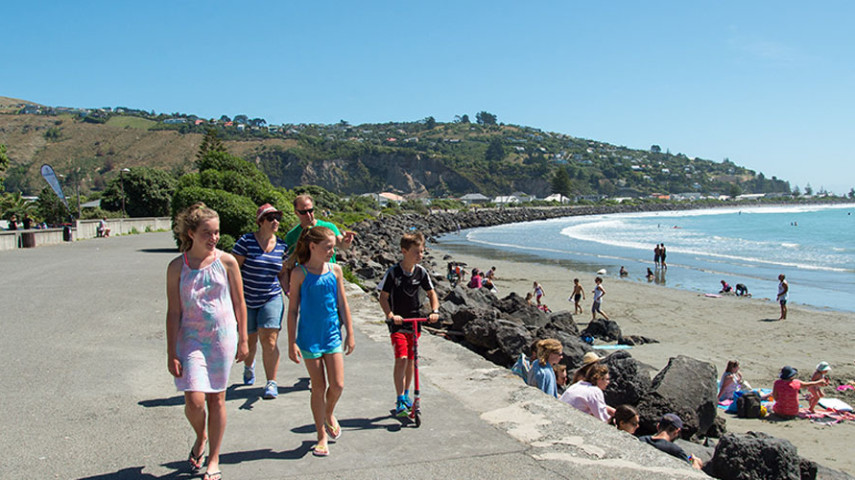 The promenade is a wide asphalt path on the seaward side of the seawall and there is another path on the land side. On a summer's day the promenade is busy with other walkers, joggers, parents with strollers or people sitting and enjoying the day. Stroll along the promenade from the beginning by Cave Rock. If you want to explore Cave Rock (at low tide) wander across Sumner Beach to the seaward side of Cave Rock. It is an easy scramble through this short tidal cave and you emerge out on the other beach near the foot of a walking ramp onto the promenade. Cave Rock itself is an easy climb and a plaque on the tower remembers the Captain of the Sumner Lifeboat, Joseph Day, who saved many lives between 1867 and 1880. It is easy walking around to Scarborough Park, which sits under the cliffs. There are toilets here, as well as a children's playground and paddling pool and plenty of shading trees. No dogs are allowed in the park. For variation on the return walk try Nayland Street or the less busy Wiggins Street. There are still many interesting and homely houses that reveal Sumner's origins as a quiet seaside escape. Past the Sumner shops, if you cross Wakefield Avenue, it is well worthwhile to walk down the last part of Nayland Street with its idiosyncratic houses, stone walls and cliffs. Cross Main Street at the pedestrian island back to the car park. Find out about swimming at Sumner and Scarborough. |