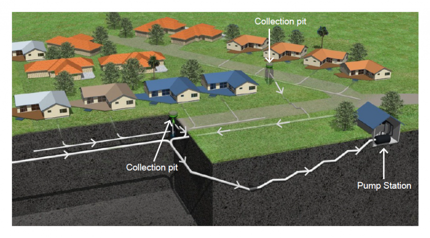 This system uses on-site property tanks with small pumps to pump wastewater out into larger, shared, street pressure mains and on to a nearby gravity system. Wastewater flows from a serviced building (house or business) into the tank via a gravity pipe (lateral). When the tank fills to a set level the pump comes on and pumps the wastewater through a pressure pipe out into a pressure main in the street which also takes wastewater from pressure tanks from the houses or businesses in the surrounding area.