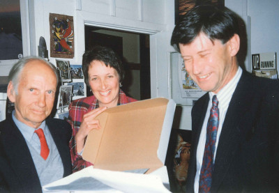 Harold Evans and Kate Dewes handing over Christchurch Declarations of Public Conscience to Cabinet Minister Philip Burdon in 1992