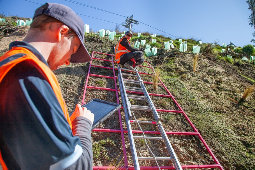 The team have prepared a 50 m horizontal section with a combination of erosion control products and suitable plants, including the New Zealand ice plant, pig fern, bracken fern, cutty grass, Banks Peninsula fescue, and silver tussock.