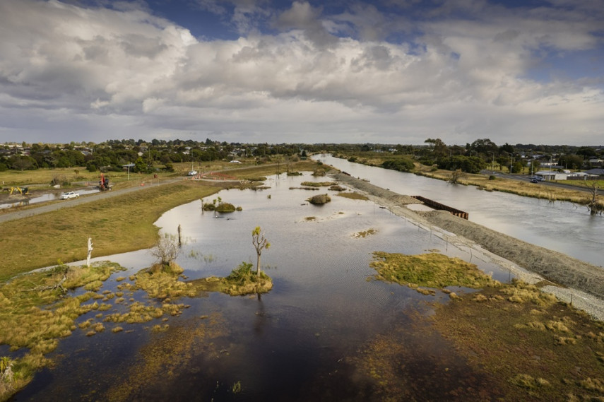 Within the regeneration area, 22km of flood management is planned, including stopbanks and floodwalls. The first 472m section of the stopbank was completed in the Waitaki Street area in February 2024. This has allowed the area on the riverside of the stopbank to revert to tidal wetland.