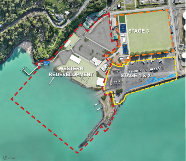 - March 2023: Work on the first major phase of work was completed ahead of New Zealand’s first SailGP event. Work included sealing part of the car park, installing stormwater drainage, upgrading site utilities, and installing floating pontoons. A waterfront walkway, with artwork created by Te Hapū o Ngāti Wheke Rāpaki also complete. Read more on Newsline.(external link)