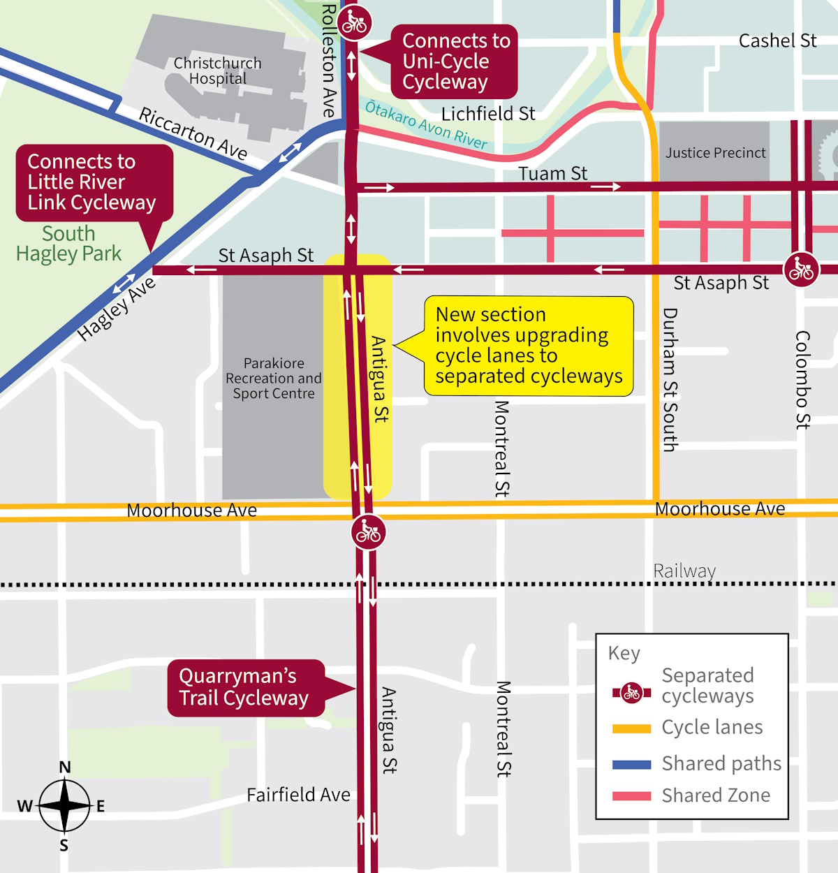 Antigua Street cycle connection map The section of Antigua Street – between Moorhouse Avenue and St Asaph Street – sits between these key cycleway routes and directly alongside Parakiore Recreation and Sport Centre, which is due to open late 2025.