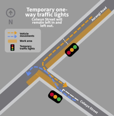 Upgrades along Aorangi Road (south) are ongoing, as is the temporary southwest-bound one-way system. The worksite will be reduced where possible as crews progress through the main stage of construction.