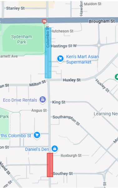 Colombo Street between Hutcheson Street and Huxley Street and between Southey Street and Roxburgh Street. |