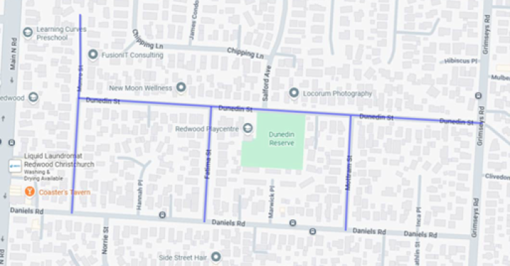 Munro Street, Dunedin Street, Fatima Street and Mottram Street, Redwood. |