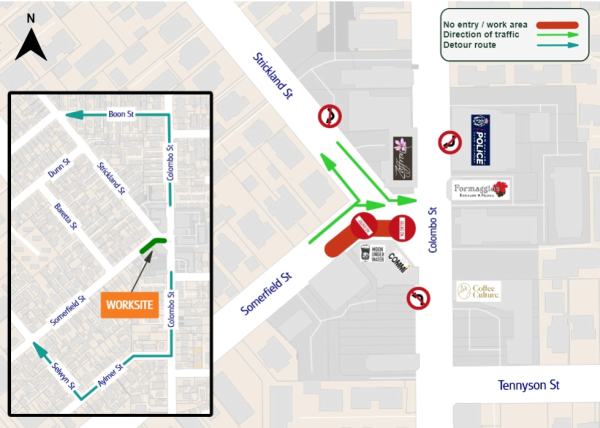 Colombo Street/Strickland Street/Somerfield Street intersection, Somerfield. |