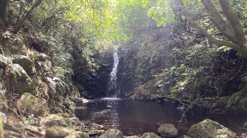 Starting from Te Oka Bay Road, 500m North of the Magnet Bay Road junction, the track traverses and descends through bush. After approximately 600m across a large grassy clearing, there is a signposted hard right turn, and the track descends steeply, re-entering the bush and dropping to the Te Kaio Stream. Just before the river crossing, there is a signposted 10-minute return track to visit a waterfall. After crossing the river, the track climbs gradually through the bush until arriving at a stile at the junction with the Middle Spur Track. |