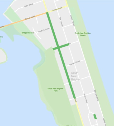 Estuary Road from Bridge Street to Halsey Street. Beatty Street from Pine Avenue to South New Brighton Domain. Adjacent to 407 Pine Avenue, South New Brighton.