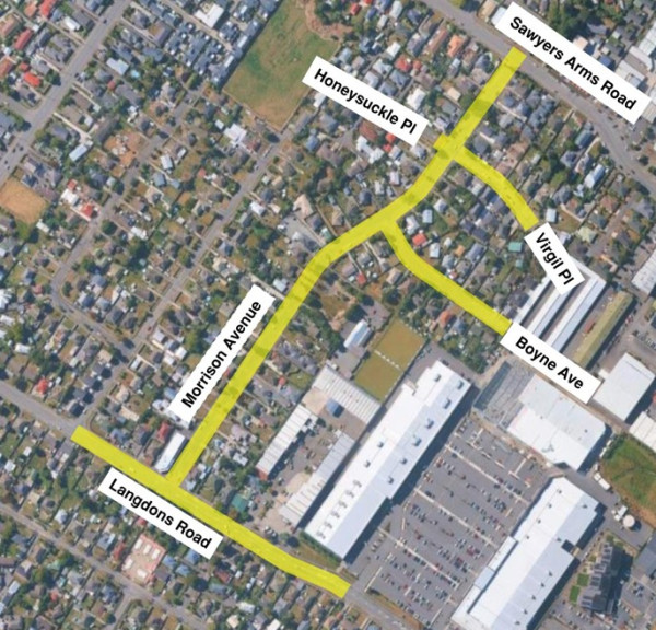 Morrison Avenue, 159 to 131 Langdons Road, Boyne Avenue, Virgil Place, and into Sawyers Arms Road. |